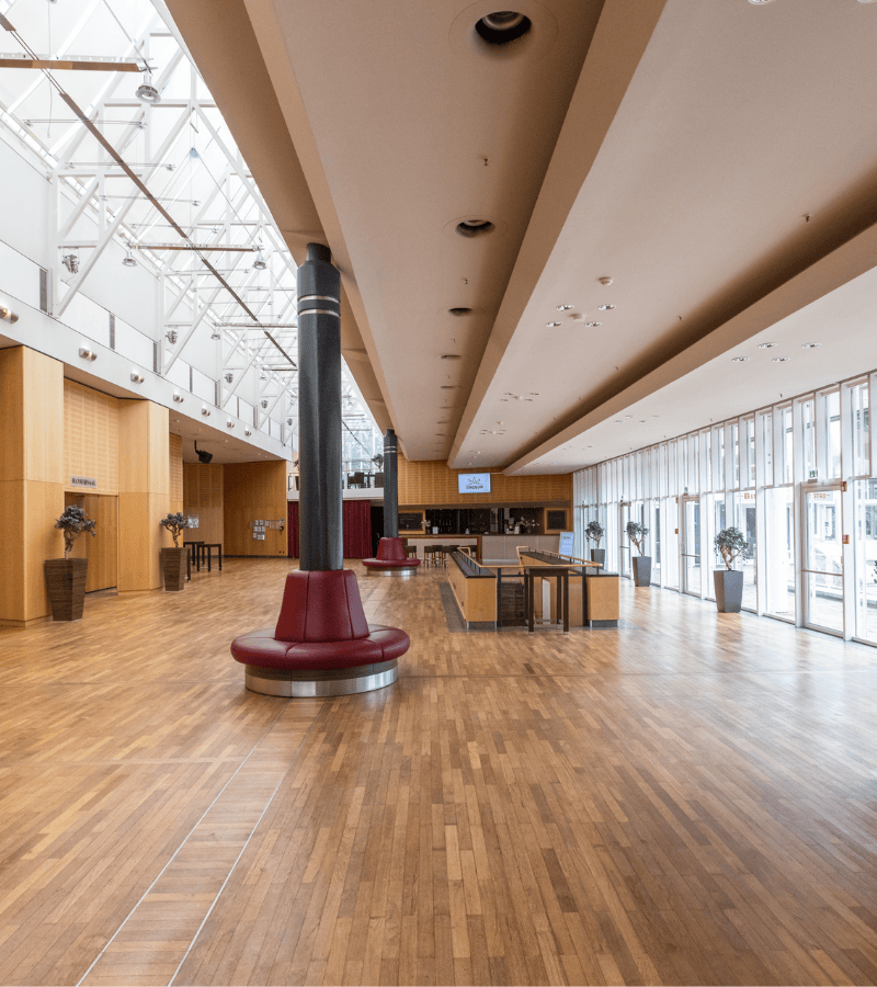Im oberen Foyer auf 450 m² finden Sie die direkten Zugänge zum Hansesaal bzw. Theatersaal sowie zwei feste Tresen zur Bewirtung Ihrer Tagung. Die Größe des oberen Foyers kann je nach Bedarf um die Fläche des Hansesaals oder um einzelne Bereiche des Saals erweitert werden.